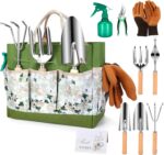 - 【🛠️ All-in-One 10-Piece Gardening Kit with Floral Tote】Your complete solution for daily garden care: Includes pruning shears, weeder, transplanter, cultivator, and 4 essentials + reinforced floral tote bag & greeting card. From planting seedlings to pruning branches, this comprehensive set tackles every task while the multi-pocket tote prevents clutter—ideal for balconies, flower beds, and urban gardens.