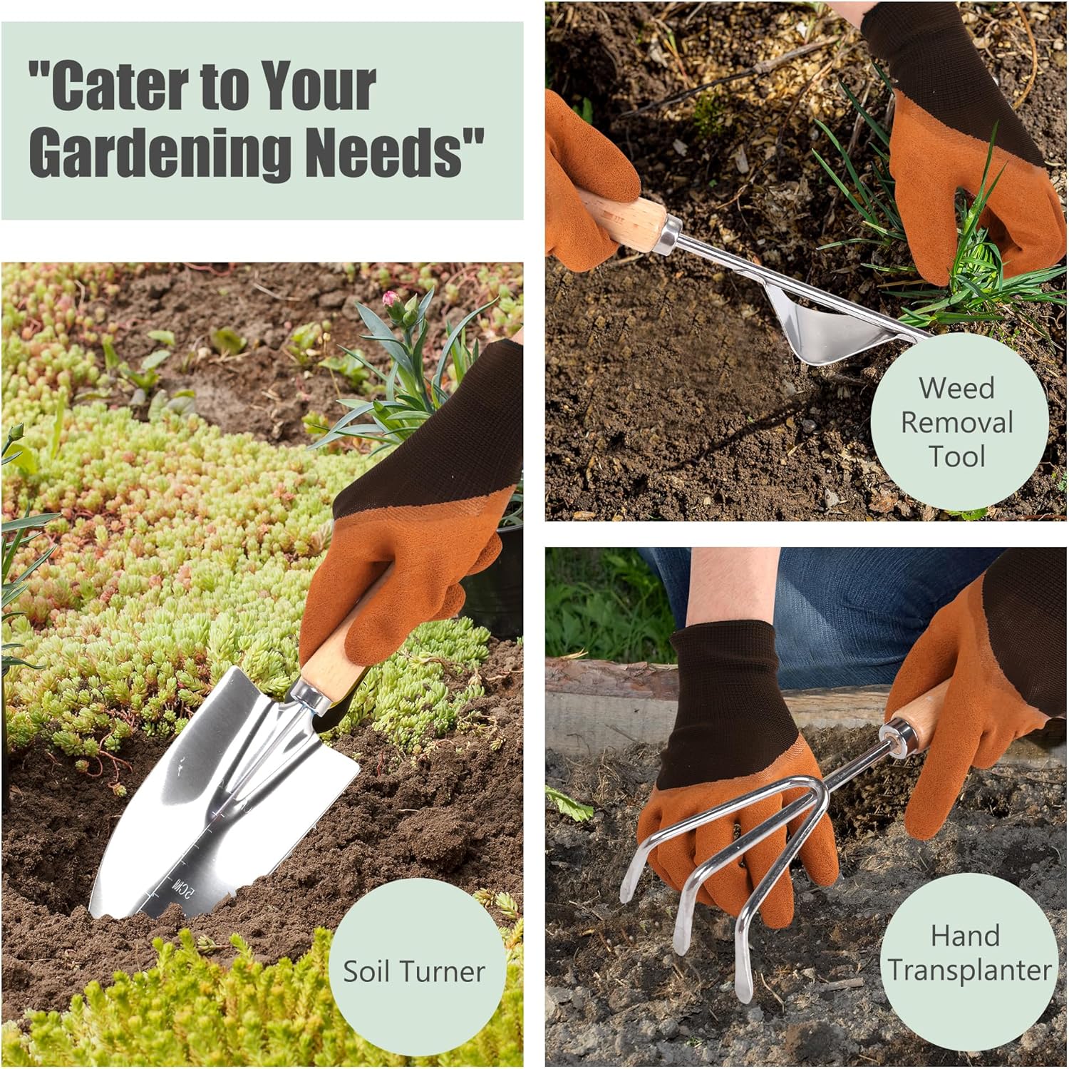 - 【✋ Ergonomic Wooden Handles for All-Day Comfort】Non-slip wooden grips with angled design fit hands of all sizes (seniors, kids, or gloved hands). Hanging holes enable quick storage, while the reduced wrist strain makes digging, weeding, and transplanting effortless—no more blisters or fatigue.